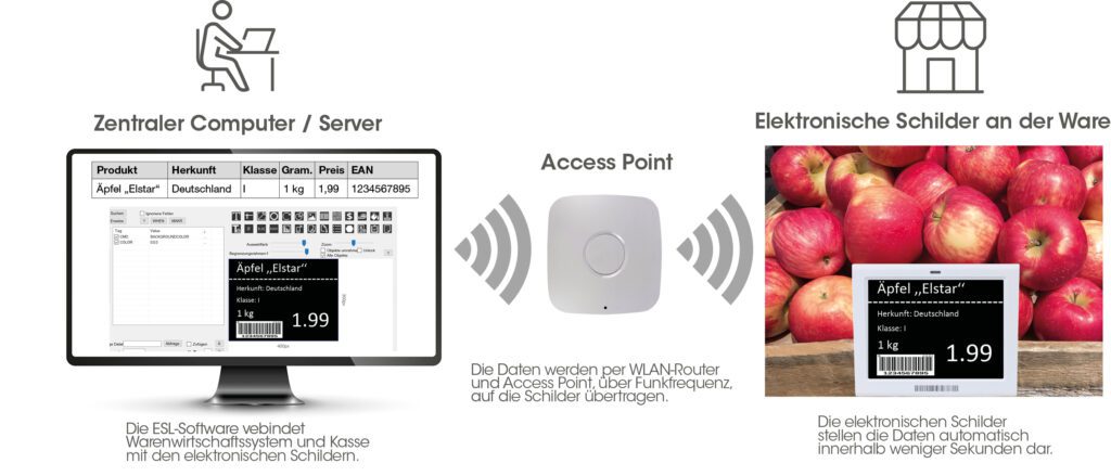 Mit einer ESL (Electronic Shelf Label) Software werden an einem zentralen Computer Schild-Layouts gestaltet. Die Software greift auf das Warenwirtschafts- und Kassensystem des Servers zu und generiert aus Schild-Layout und Produktdaten vollständige digitale Schilder. Die Daten werden dann per Funk an die batteriebetriebenen Schilder am Produkt übermittelt. Die Übermittlung erfolgt innerhalb weniger Sekunden.